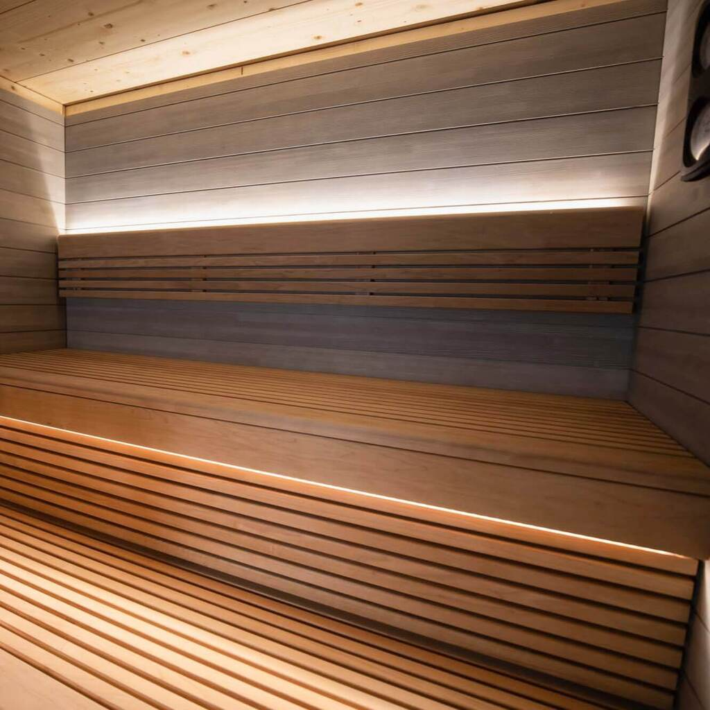 Saunaya özel seçilmiş olan LED ışıklandırma Bankların altında, sırt dayama ahşapların arkasında ve zaman zaman saunanın dış cephesinde bulunabiliyor.